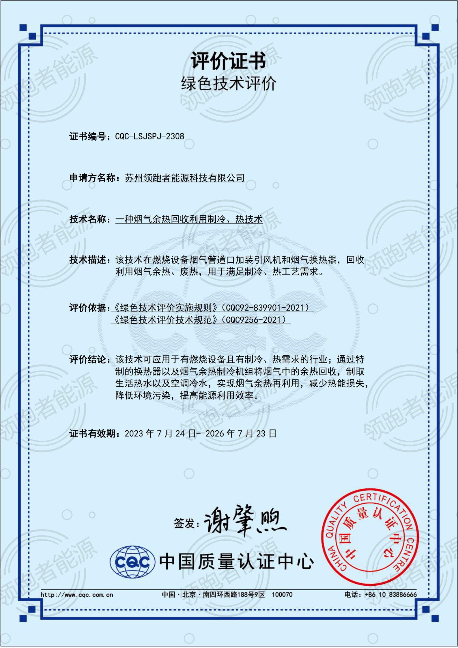 近日,蘇州領跑者能源科技有限公司榮獲由中國質量認證中心頒布的“一種煙氣余熱回收利用制冷、制熱技術”CQC綠色技術評價證書。CQC......